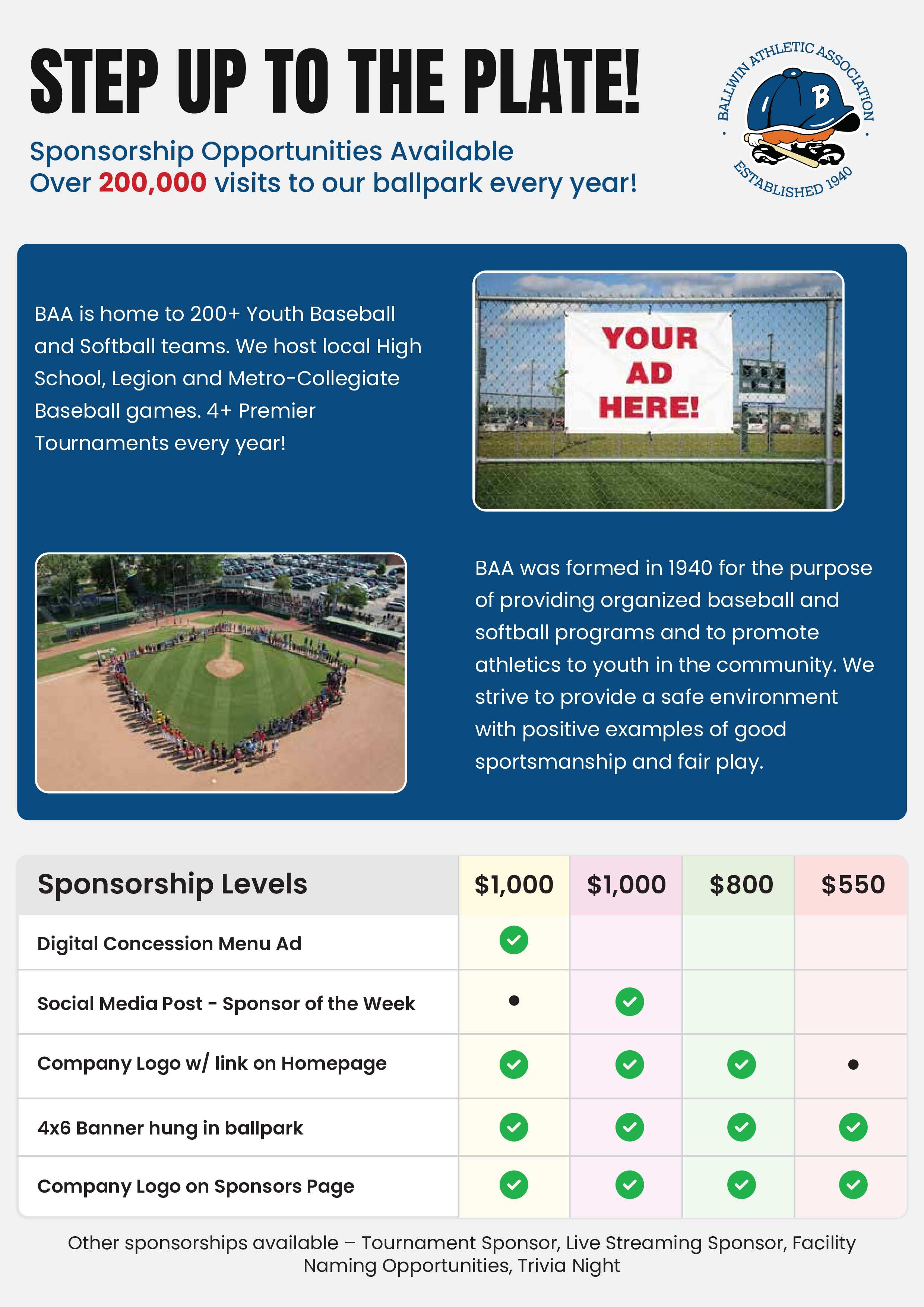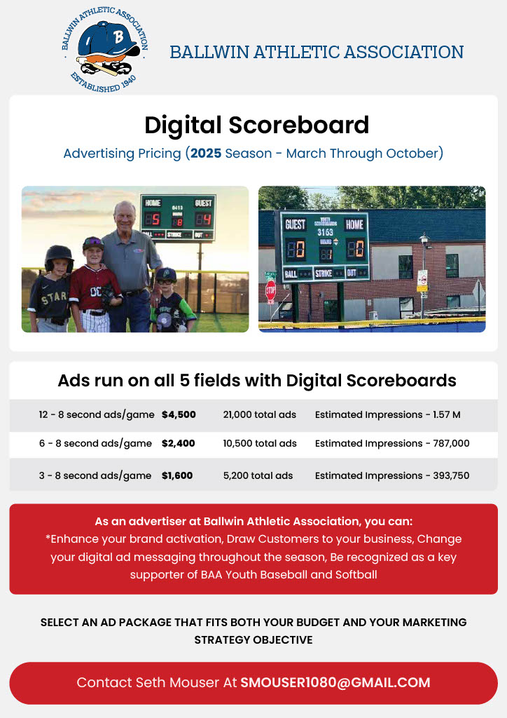 Advertise to thousands families by becoming a Sponsor of the Ballwin Athletic Association!